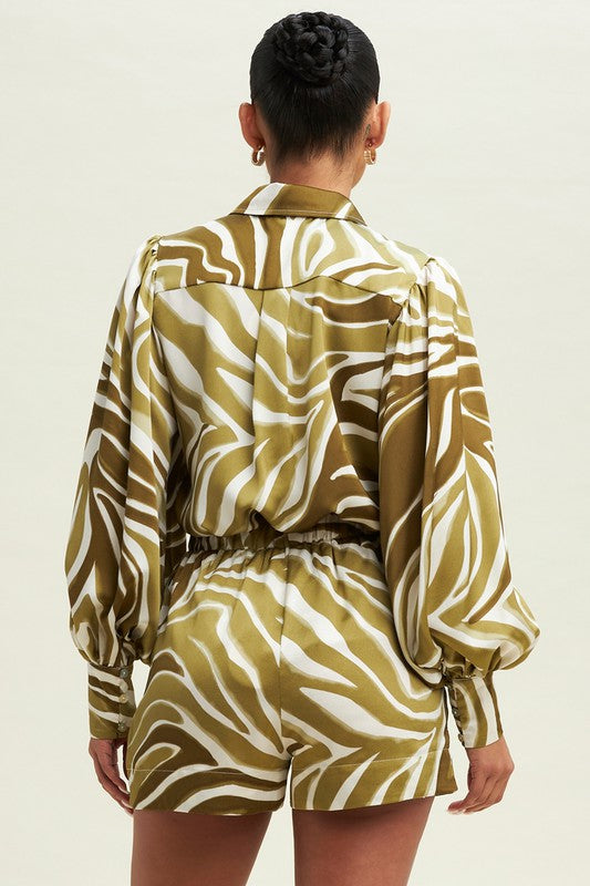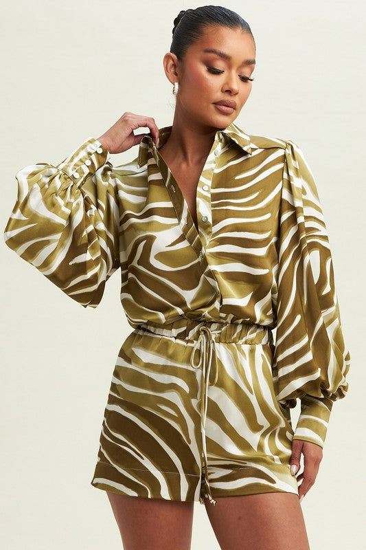 Bring the wild with the Safari Satin Set—a silky smooth two-piece that balances fierce print with effortless polish. Featuring a zebra-inspired pattern in rich olive and ivory, the set includes a billowy button-up blouse and matching drawstring shorts. Lightweight, luxe, and made to be styled up or down, it’s your go-to for statement leisure and glam getaways.
