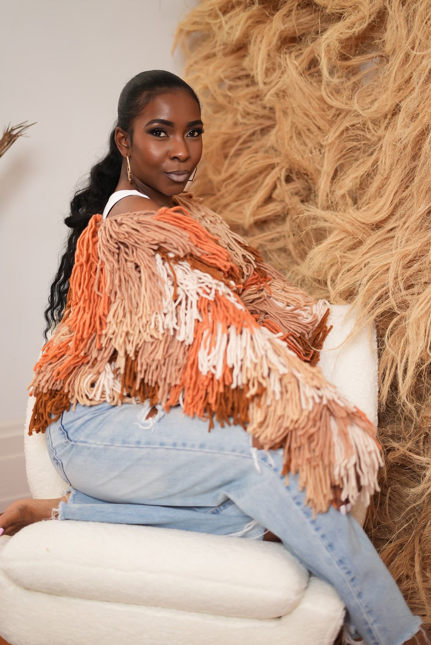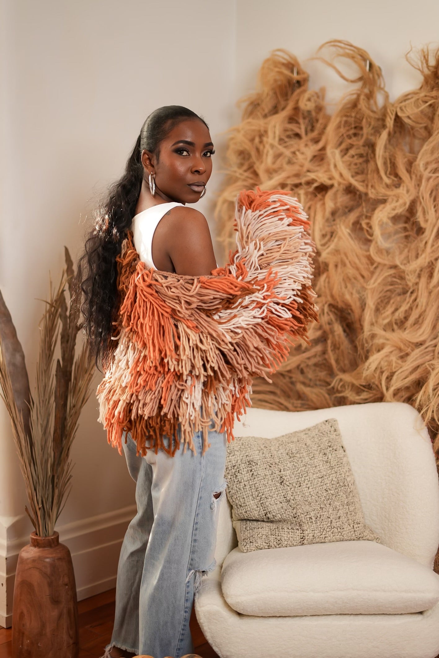 Turn texture into a moment with the Cozy Shag Jacket. Featuring chunky multicolor yarn in warm, earthy tones, this piece is less of a jacket and more of a fashion mood. With exaggerated sleeves and a loose, draped fit, it brings the drama without sacrificing comfort. Whether you’re dressing up basics or layering for impact, this jacket guarantees all eyes on you.