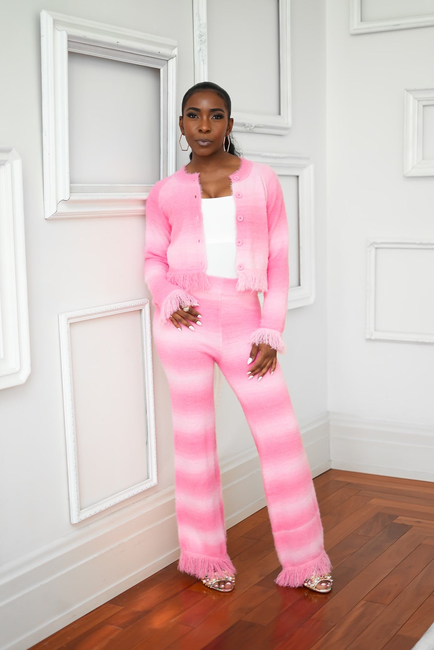 Sweet, but not soft. The Crush Knit Set delivers a dreamy gradient of pinks in a plush knit that feels just as good as it looks. With a cropped button-front cardigan featuring fringe detail and coordinating wide-leg pants that sway with every step, this set is the perfect blend of cozy and glam. Made for the woman who can be sugar and spice—all in one outfit.
