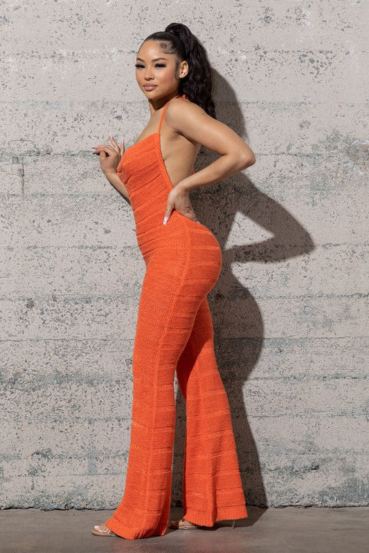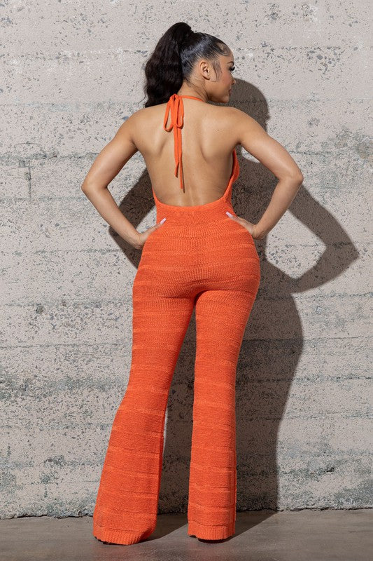 Bring the heat in the Flame Knit Halter Jumpsuit—a fiery one-piece that sculpts, hugs, and highlights every curve. Made from ultra-stretch ribbed knit in a striking flame orange hue, this backless beauty features a draped cowl neckline, tie-back halter, and flared legs for added drama. It’s bold, body-celebrating, and made to stop traffic.